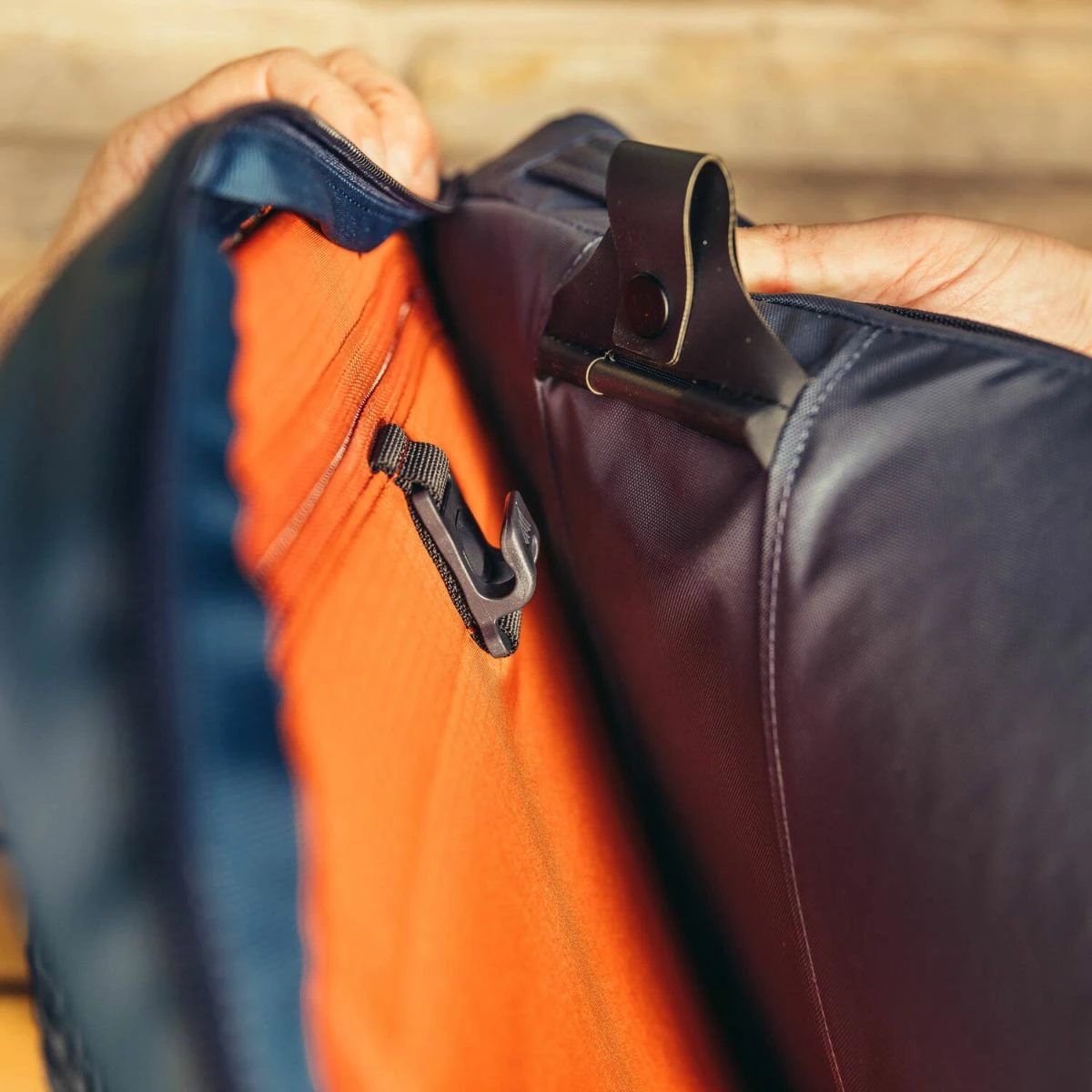 β’ Tubular webbing haul handles and custom comfort-grip molded zipper pullers