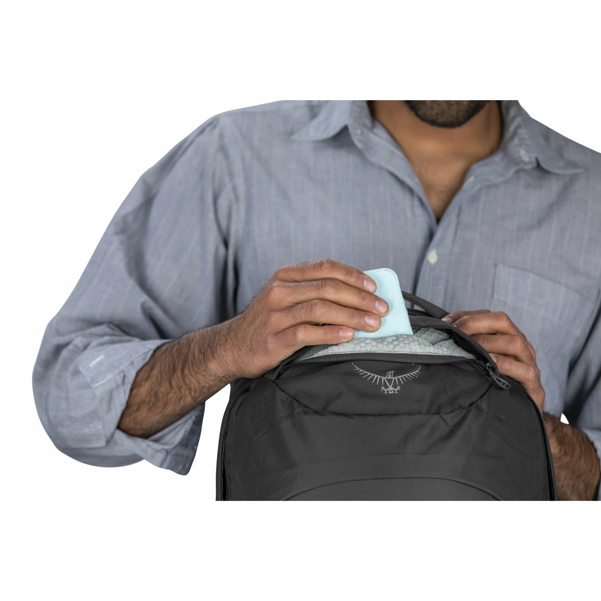 β’ Front panel organization pocket with key clip