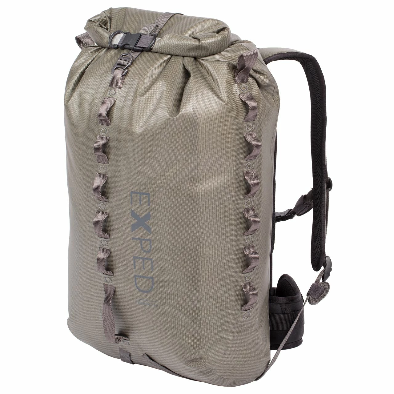 Construction: The pack body is built with 840-denier Oxford nylon to achieve its amazing durability. Welded seams and TPU film laminated fabric (10,000mm water column rating) ensure a completely waterproof main compartment and the roll-top closure (secured with either quick-closing small carabiners or a quick-release buckle) makes for a pack that will withstand a soaking. The roll-top also allows expansion of the packβs capacity when overloading is necessary. A removable, adjustable strap extends over the top of the pack and is secured to the front daisy chain with EXPEDβs Rapide Hook, compressing and stabilizing the load. This also allows items to be attached to the top of the pack, further extending Torrentβs carrying capacity. Three integrated and vertically oriented daisy chains, one on the back and one on each side, provide a multitude of attachment options for difficult-to-pack items such as trekking poles, fly rod cases, ice axes, tent poles, etc.